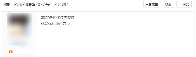 面对这个质疑,有的人认为两者半斤八两,有的人觉得首发72%好评率的《赛博朋克2077》更胜一筹,但更多的回复,其实都是在强调“《艾尔登法环》只是差在优化,而《赛博朋克2077》内容也不太行”这个观点。也就是说,只要将《艾尔登法环》的优化问题解决,它依旧是一款优秀的作品。