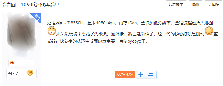 同时,也有部分玩家表示即使自己配置比差评里面的人要低,也完全没有遇到里面所说的掉帧等问题,甚至有玩家发现自己的1050ti还能继续坚挺。