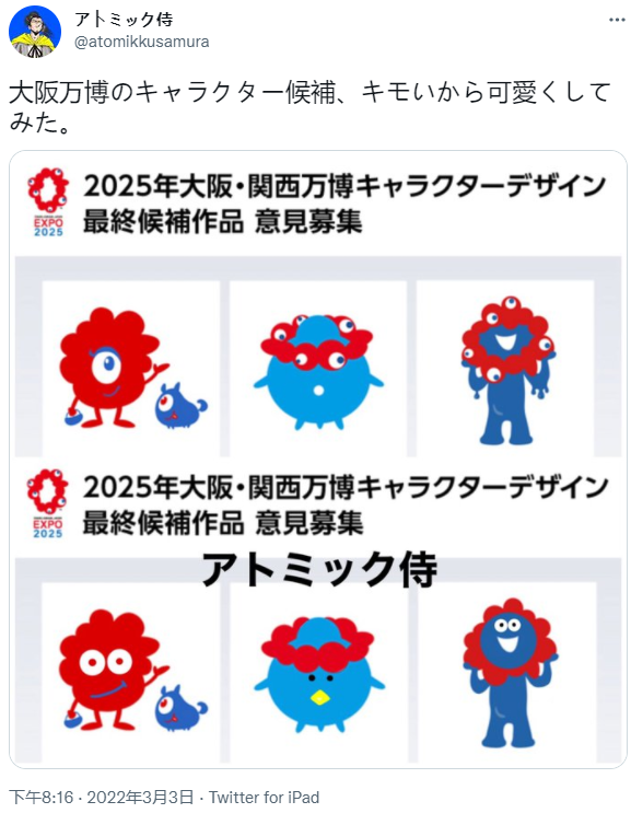 事已至此,想要让大阪世博会官方改掉名单,已不可能。日本网友能做的,就是接受。不过,世博会对于一个国家而言,毕竟是件关乎国际影响力的大事,搞这么一个奇怪的东西当吉祥物,多少会令一些国外游客感到生理不适。因此,一些日本网友开始着手候选吉祥物的“美化”工作。不得不说,经过一些网友的美化,这三个候选吉祥物还真有种“脱胎换骨”的感觉。