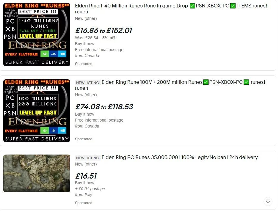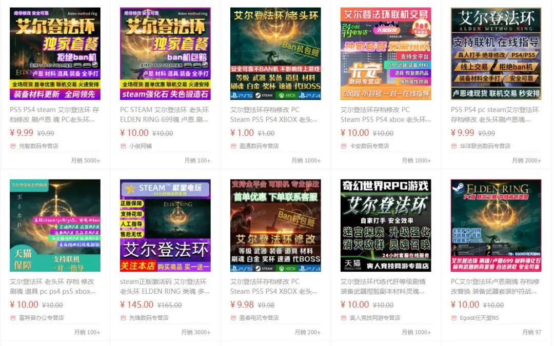 《艾尔登法环》发售后不久,淘宝上就出现了贩卖游戏中的卢恩、以及各种道具的商家,一条灰色产业链悄然形成。