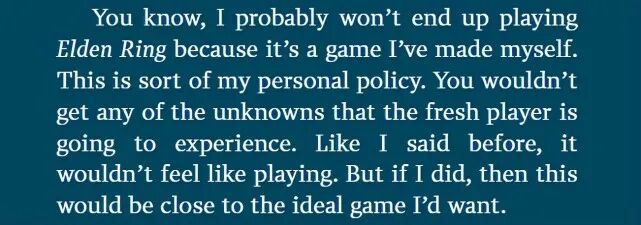 “我大概不会玩《艾尔登法环》,因为这是我自己做的游戏,我不会有任何探索未知的新鲜感。”——宫崎英高