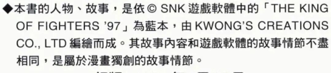 细说起来,港漫《拳皇》的确是SNK官方授权的产物。《拳皇》第一部港漫为《拳皇96》,封面的左上角,清晰地标明“SNK正版授权出版”。之所以不少人将漫画的剧情与游戏混为一谈,SNK可谓“功不可没”。加之,港漫《拳皇96》虽然是繁体中文,但大陆观众基本没有阅读障碍。而《拳皇》游戏却很长一段时间内没有中文,很多读者也就无从去辨别真伪。