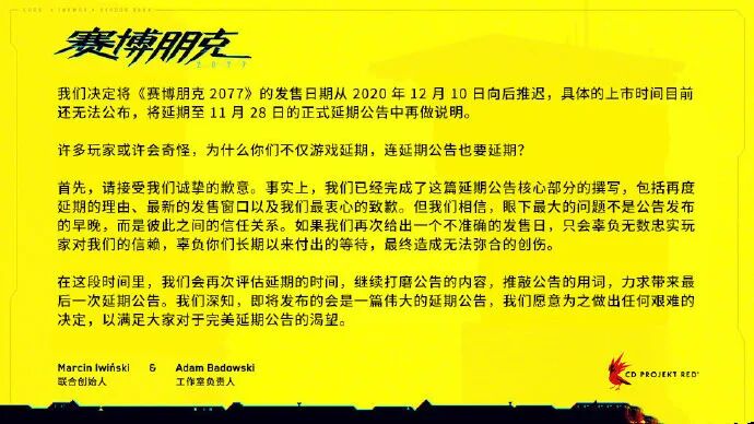 即便如此,《赛博朋克2077》也已经有过三次延期,甚至于CDPR这张黄底的延期公告,被各大游戏公司和玩家争相玩梗,成了不折不扣的黑色幽默。