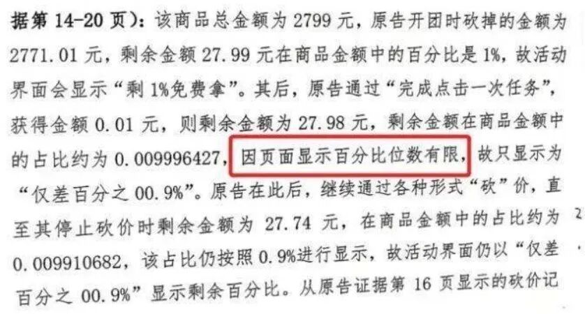 针对刘律师的上诉,拼多多则回应称,由于刘律师完成一次任务获得0.01元,剩余金额在商品总金额的占比极小,已经排到了小数点后九位,但是,活动页面显示的百分比位数有限,因此才会出现一直差00.9%。