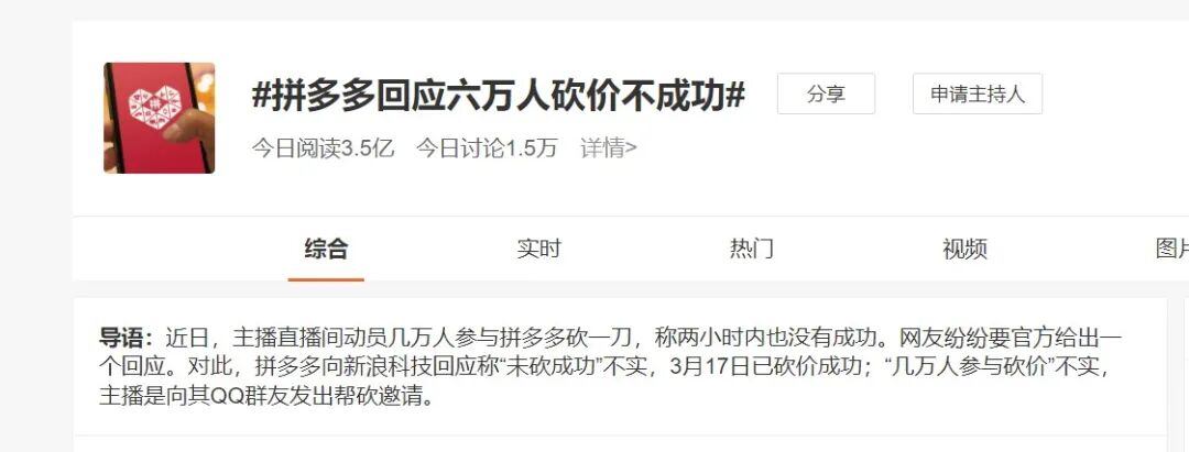 同时,拼多多强调,原本一个砍单成功的案例,在某种蓄意推动下,成了和事实截然相反的热搜、热议话题。公司法务部门已完成相关证据保全。
