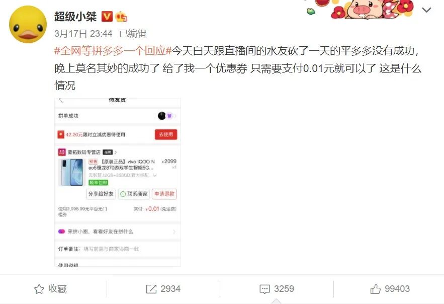 事情到这里还没有结束,更加吊诡的一幕出现了,就在3月17日晚间,超级小桀的免单居然又莫名其妙地成功了,系统给了他一个优惠券,只需花费0.01元,即可买到那部手机。