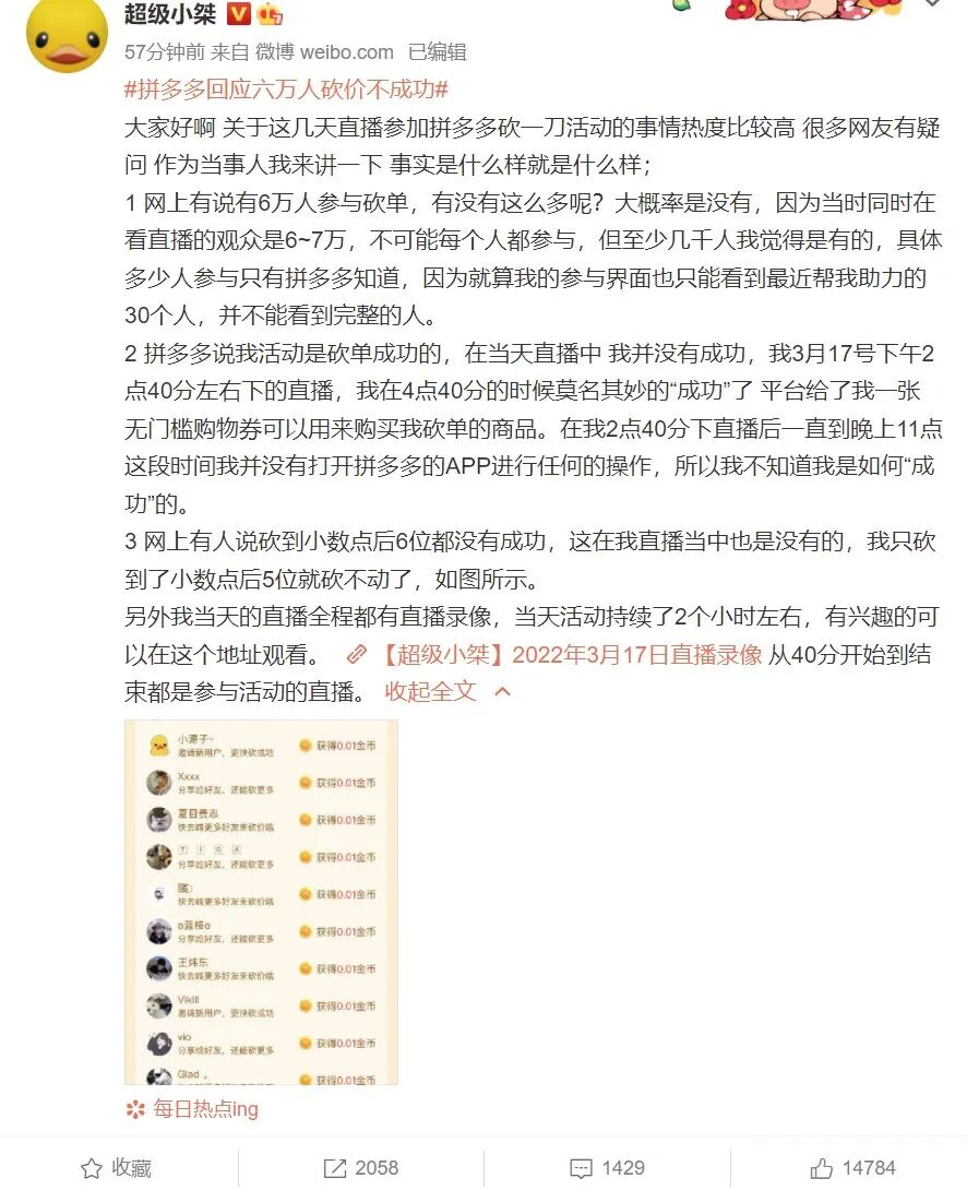 就在拼多多做出回应后不久,主播超级小桀亦进行了回应。他坦承表示,参与砍单的人数,大约在几千人左右。当天下午2点40之前,也就是在直播中,他并没有砍单成功,当时砍到了小数点后五位。下播后,他一直没有再打开拼多多,但神奇的是,当天下午4点40分的时候,砍单莫名其妙地就成功了。后来他补充说,砍单成功的动画效果,是5点左右才收到的。