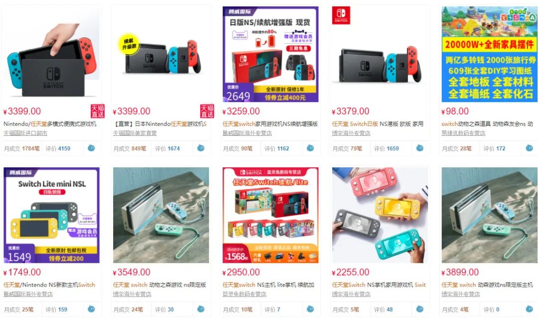 当然,以上只是官方推荐价格,实际上许多商家的定价是要远高于这个价格的,比如国内淘宝上关于日版NS的价格就在3400元左右,比官方定价高了一千多。而任天堂与腾讯合作的国行NS售价则在2000元左右。虽然国行NS由于审核原因导致游戏内容过少,但是由于相较于日版低得多的价格,在淘宝上依然取得了还不错的销量。