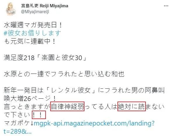 但宫岛礼吏在个人推特给出了强硬的态度“不建议心理承受能力弱的人观看”。
