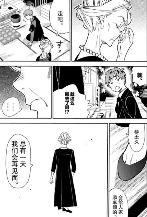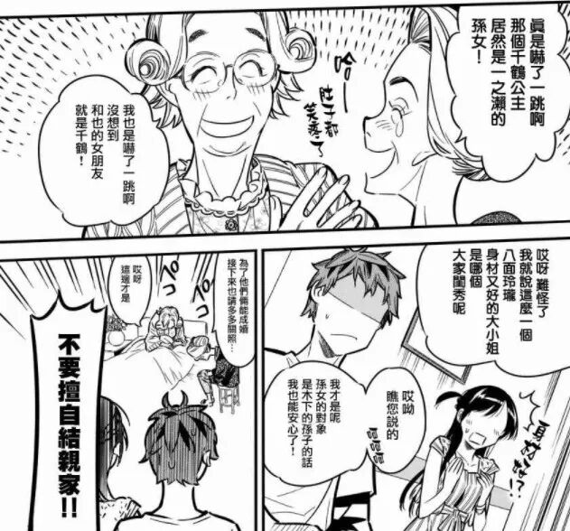 但《租借女友》中的家庭不是这样。虽然女主的家庭只剩下奶奶一个人,但男主父母和奶奶的人物设定,都更贴近于现实中的普通人形象。多位长辈也都和小辈进行过类似“媳妇/女婿见公婆”的对谈,这显然是恋爱漫画中十分少见的部分。