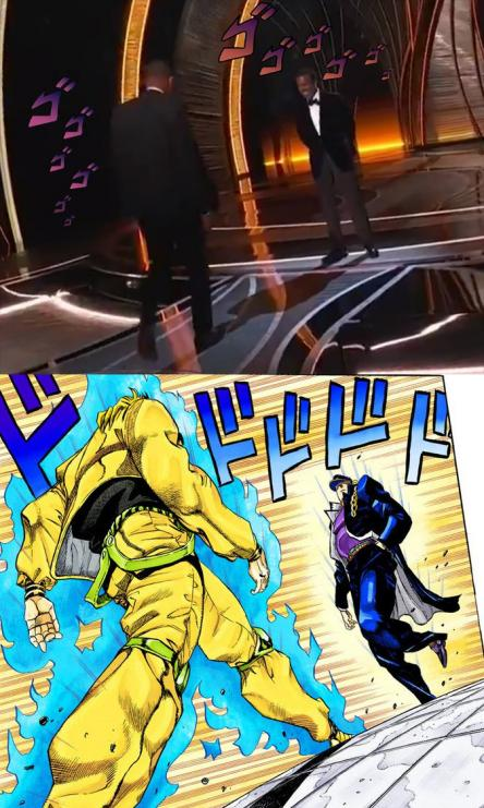 还有的名场面使用,让人比较意想不到。或许是威尔·史密斯上台的姿态过于风度翩翩,让网友们联想起DIO爷走向乔太郎那六亲不认的步伐。而当他们细心地为其配上JOJO那标志性的具象化语气词时,场面一度非常有“黄金精神”。
