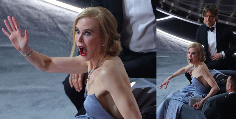 不知道是因为这一幕太过令人震惊,还是日常生活比较和谐,妮可·基德曼(Nicole Kidman)在事情发生时被吓得目瞪口呆,忘记表情管理的她嘴里能塞下她的拳头。