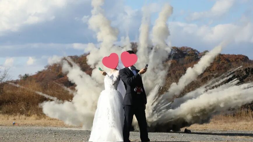 看着这张照片,关注点不同的人们,已经开始自由地发散思维。若是只注意背景中魄力十足的爆炸,日漫爱好者可能会由“爆炸”直接跳转到藤本树最近的短篇《再见绘梨》;如果从婚纱入手,由“爆炸+结婚”还会想到近期大热的《间谍过家家》;上了岁数的电影爱好者们,则会从这熟悉的构图中,联想到从上世纪就开始流行的“硬汉从不回头看爆炸”。