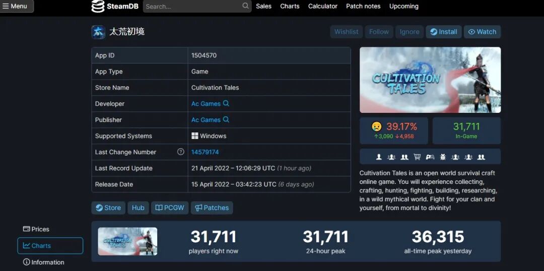 4月15日,国内工作室擎龙互娱(Ac games)的游戏《太荒初境》以“抢先体验”阶段上线Steam,售价68元人民币,并附带9折优惠。发售当天,《太荒初境》PCU(最高同时在线玩家数)突破2万,而后随着直播平台主播的推动和玩家之间的口口相传,5天之后的4月20日,《太荒初境》的PCU突破3.6万。
