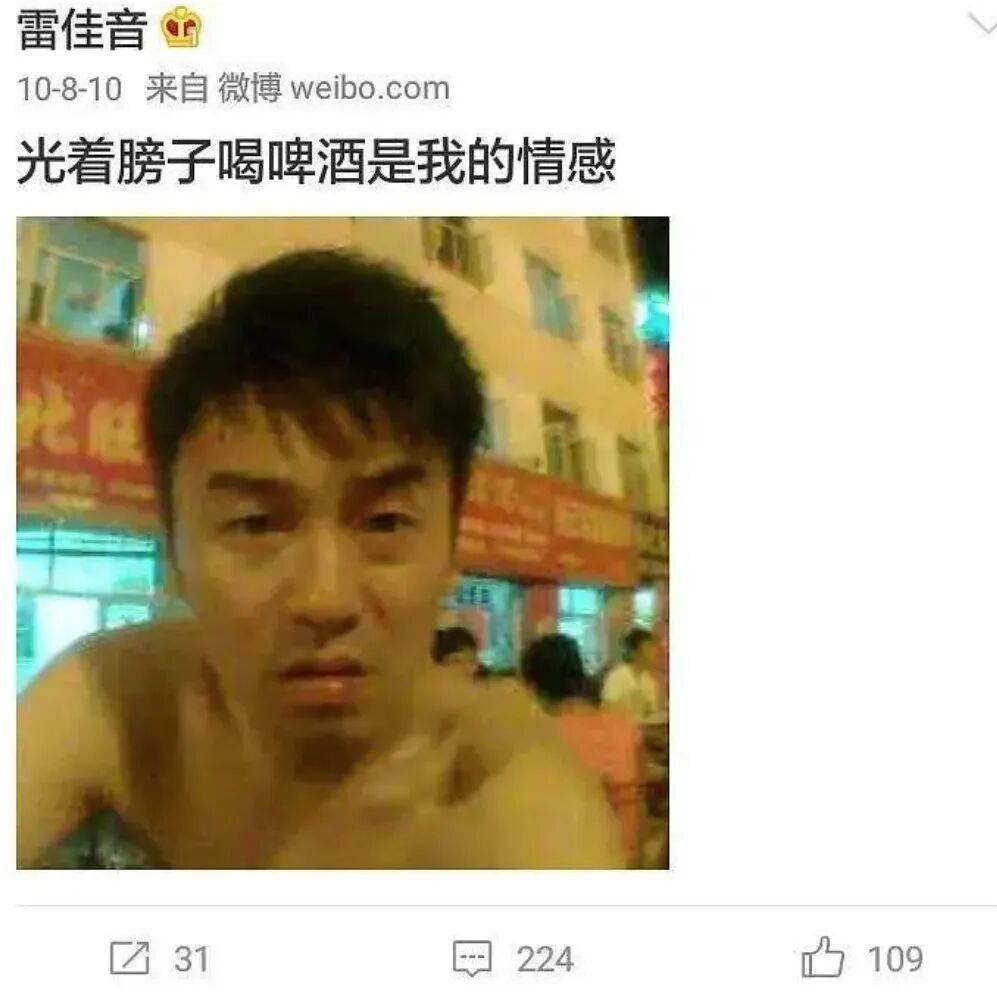 而在更早的2010年,雷佳音甚至还发布了自己赤裸上身在闹市喝酒的图片,丝毫不顾及明星的形象,也不介意自己的身材被网友调侃。