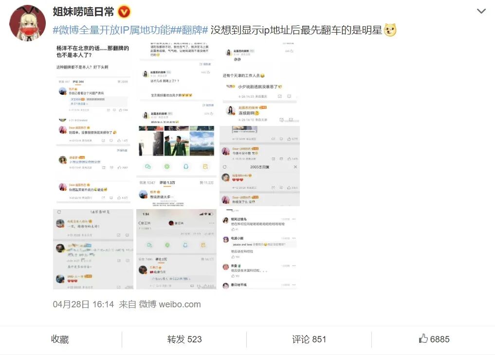 就在前不久,微博全量开放了IP属地功能,发布者所在的地区,已经清晰地出现在微博小尾巴上。至此,工作室代明星运营微博的这层窗户纸,算是被直接捅破了。诸如明星本人不在北京,但微博却发自北京的尴尬场面,已经被摆到了台面上。