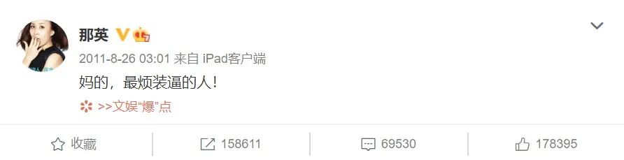 如果以2013年前后作为一个分水岭,微博的历史,可以拆分成前后两个时代。身处后微博时代的00后们,可能很难想象得到,前微博时代究竟是一个什么样的舆论环境。当时的微博,承担着和今天朋友圈类似的功能,明星习惯在微博分享自己的生活感悟。那个时代,很多明星都以胆大敢言著称,这其中就有那英。