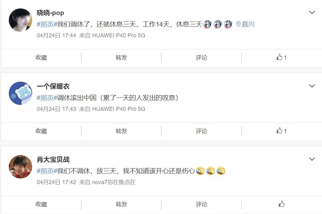 这条微博里,那英的吐槽很真切——为了调休,孩子要连着上七天课,占用原本的周末不说,放假的时间也没有真的变长,反而导致更加疲劳。而调休凑出来的小长假,更是打破了原有的生活节奏。至少,对于当时的那英而言,调休带来的更多的是弊端。