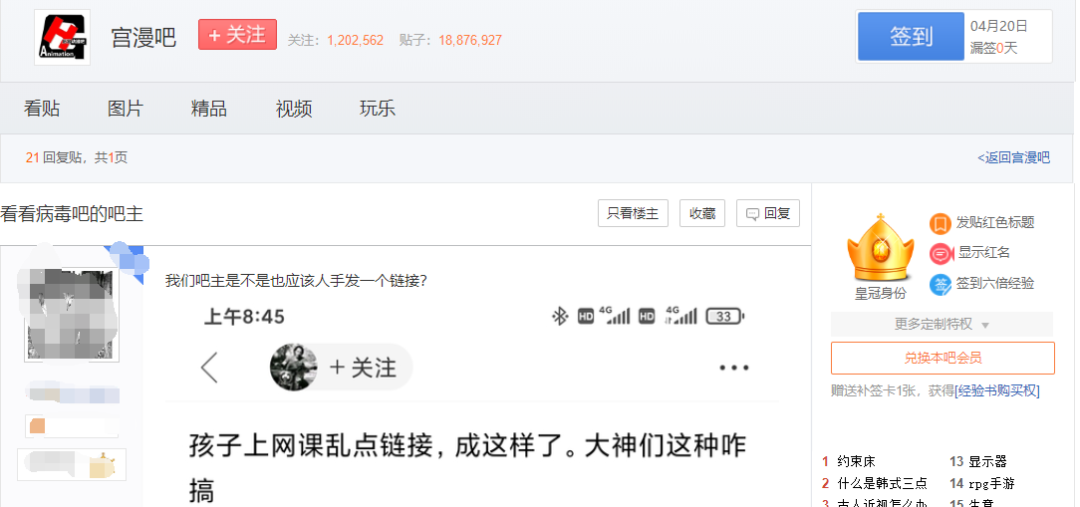不过,或许正是这种“每问必答”的特性,才使得病毒吧吧主这次成为了百度贴吧的新名人。在他的热度下,病毒吧也一度出圈,大批网友入驻病毒吧。随着贴吧中的帖子变得越来越多,各种各样的问题层出不穷,即便是有问必答的病毒吧吧主,也有点hold不住了,不得不发帖表示自己需要休息一下。