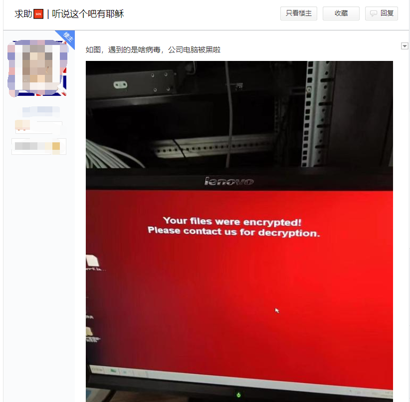 正如之前提到过的那样,与技术相关的贴吧,其中求助帖和解答帖的比例往往会更大,真心想要解决问题的吧友,也相对较多。而病毒吧吧主最开始在整个百度贴吧破圈,就是因为一个有关“电脑病毒敲诈勒索”的求助帖。从求助者的帖子可以看到,这名吧友的电脑被有心者恶意用病毒攻击,随后遭遇勒索。