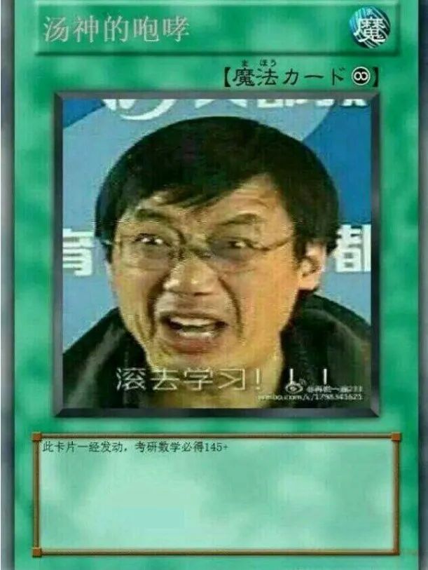 打游戏王的牌佬听到这句话,为了将这句灵魂拷问谨记在心,特意跑去印了张“XX的咆哮”系列新卡“汤神的咆哮”。这张卡的效果非常假“一经发动,考研数学必得145”,如果分析其中暗藏的K语言,自然会发现这卡自带全抗“发动就行”。