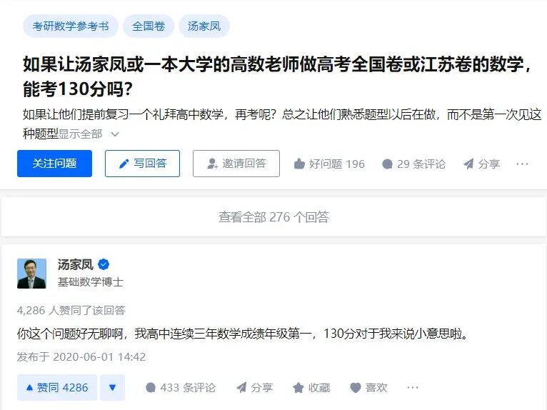 知乎的“数学汤家凤”看到有关自己的提问时,不仅会主动下场回答,还能轻松写意地凡尔赛“你这个问题好无聊啊,我高中连续三年数学成绩年级第一”。