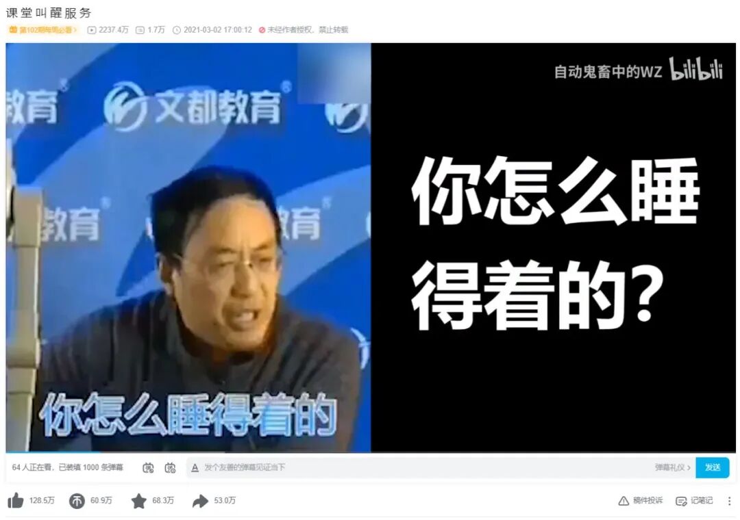 但2021年3月2日,B站up主“自动鬼畜中的WZ”制作的鬼畜视频《课 堂 叫 醒 服 务》,将汤家凤的灵魂拷问“你这个年龄段,你怎么睡得着的”推到了“网络热梗”的高度。