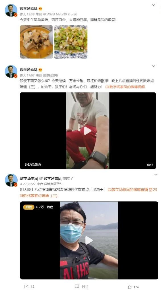 新浪微博的“数学汤家凤”,如果不是时常直播讲解自己分析的各种考研知识点,你说他是体育老师兼职美食博主我都信。
