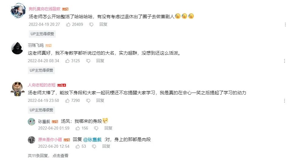 在这则更新不久播放量就已经近400万的视频下,我们能看到大量学生对汤家凤的评价。有学生感谢他教学内容的详细“非常适合我这样的零基础入门”,有人玩着他的梗“这个年纪你怎么跑得动的”,还有在大学课堂听过现场课的学生表示“这老头上课表情和要吃了我似的,没想到还能整活”——被汤家凤点了个赞。