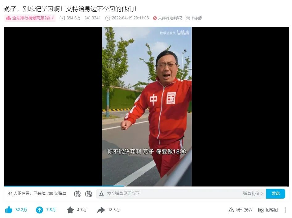 而在B站,他在前不久更新的“整活”视频中,模仿了电影《从你的全世界路过》中的岳云鹏追车桥段。只不过,“猪头”追“燕子”是为了爱情,穿着“中国同款”的汤家凤追“燕子”,是为了劝“燕子”继续做题,为考研“上岸”努力。