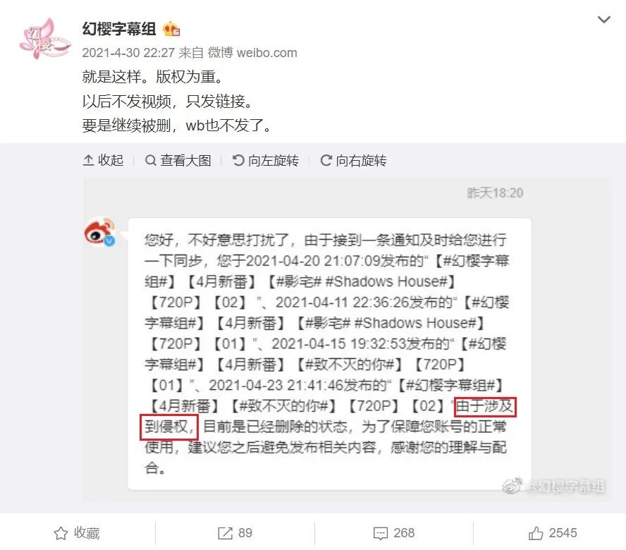 无独有偶,就在脸肿汉化组出事后,另一知名字幕组幻樱字幕组,紧急宣布暂时关闭论坛,停止新番更新。就在2021年4月底,幻樱字幕组正式确认,今后将只发新番链接,不再发布视频。而背后的原因,直指内容“侵权”。