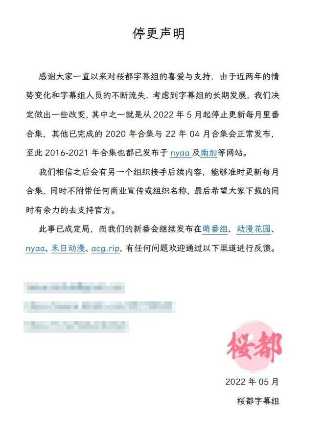 桜都字幕组不会是最后一家停止更新的字幕组,在未来,只会有越来越多的字幕组,步上桜都字幕组的后尘。