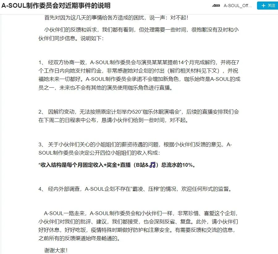 5月14日,A-SOUL_Official发布《A-SOUL制作委员会对近期事件的说明》,试图挽回企划的声誉,但这则说明被指出和11日凌晨发布的《A-SOUL制作委员会的临时QA》相同,都拥有诸多疑点。那些看上去是正面回应的部分,其实有文字游戏的嫌疑,比如“公开四位小姐姐的收入构成”被怀疑是临时改变了剩余4人的薪资结构。