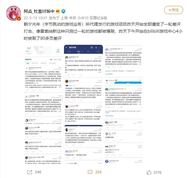 无论是B站的游戏评论区,还是TapTap的游戏评论区,甚至是五花八门手机品牌的应用市场渠道,和朝夕光年工作室有关的游戏,都遭遇了程度不同的差评攻击。