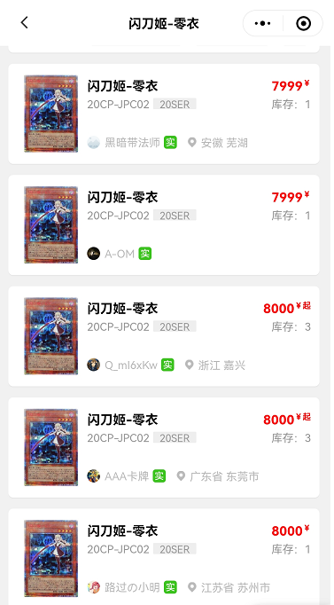 一张顶级罕贵度的“闪刀姬-零衣”,在市场上能卖到8000块