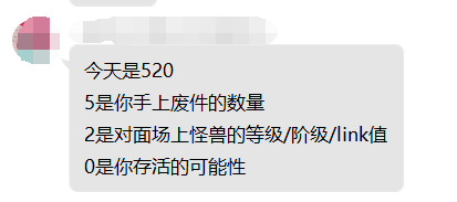 至于原因,大概率还是因为5月20号的“520”与中文“我爱你”谐音,从而莫名触发了牌佬的诸多“羁绊”和梗。520最近强行和“我爱你”挂钩,并逐渐被承认为另一个情人节,大抵是这些年商家宣传造势的成果。但《游戏王》圈子中,牌佬们有关恋爱的梗,那却是“流传已久”。如果说,一般人在520这天,晒的都是约会对象,撒的都是“甜蜜狗粮”——那么,牌佬在520当天,除了刻在DNA里的打牌外,玩的都是“牌佬不取对象”的笑话。