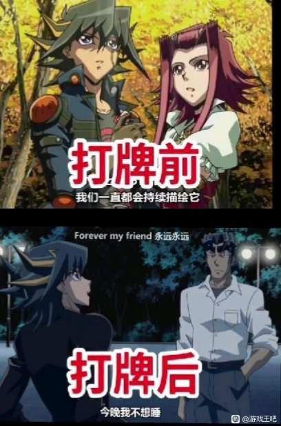 另一方面,则是在《游戏王》的很多部TV动画中,“牌佬不需要女朋友”的刻板印象,被剧情所无限放大。为了强调主角们通过打牌建立起来的友情和羁绊,剧情往往会淡化有关女主角的戏份,其中有关恋爱的部分,甚至会出现前后矛盾的“吃书”情况。例如《游戏王DM》中的杏子,虽然被定为女主,但全剧的戏份并不出众,其人物刻画甚至被一些观众称为“绿茶”。与之相比,无论是游戏与海马的棋逢对手,还是游戏与城之内的深刻友情,都更让观众印象深刻。在这种“重男轻女”的剧情趋势下,《游戏王》甚至被观众称为“游基王”。事实上,“牌佬不需要女人”一开始就只是来自动画的梗,只不过现实与动画多少有些相近,才会成为牌佬们调侃自己的原因。