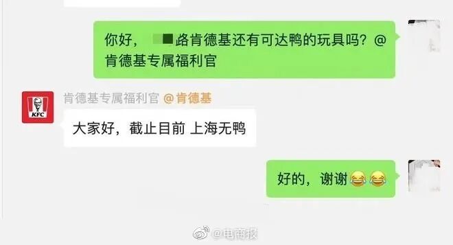 甚至也有传言称,可达鸭卖断货背后,是肯德基内部的员工,自己在倒卖可达鸭玩具。有些地方甚至还出现了,需要客户充值一定金额后,才能预留玩具的说法。这些网上的传言虽然目前都没有得到证实,但不得不说,这波可达鸭的热度,多少已经有些变味儿了。