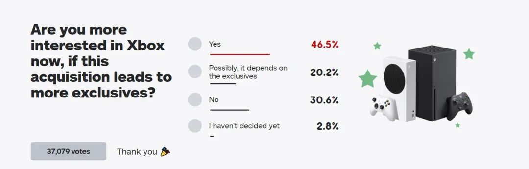 比起299美元的阉割版XSS,微软收购B社,让索尼阵营的玩家开始感受到了真正的危机感。IGN随后进行了一项全新的调查,如果微软能够拥有更多B社独占游戏,Xbox平台是否会变得更具吸引力?调查结果显示,近半数玩家认可了这一观点。