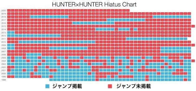 而同样是完结后一年,1998年,让无数粉丝催更到抓狂的《全职猎人》,诞生了。有关《全职猎人》拖更的记录,网络上早已有了无数极其详尽的数据报告,比如有网友制作了“富坚的休刊记录表”,随着时间推移,明显能看到表格上代表“休刊”的红色越来越多,更新频率也肉眼可见在降低。