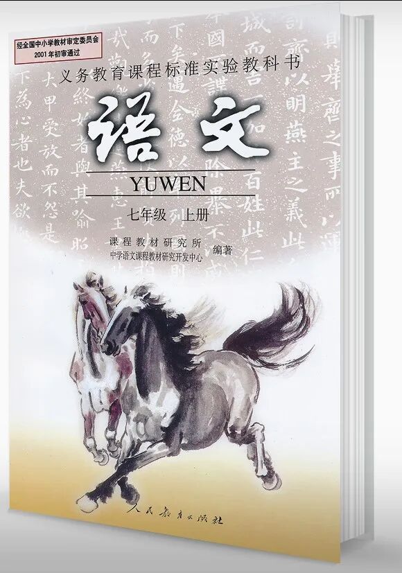 我们的教材插图,当然并非只有近期负面新闻中的劣质图画,像是人教版七年级上册语文的封面,上部有精心编排的王羲之书《乐毅论》,下部有徐悲鸿大作《奔马图》,不仅考虑到教材版式,还结合字、画两种元素,为孩子们带来扑面而来的古风之美。