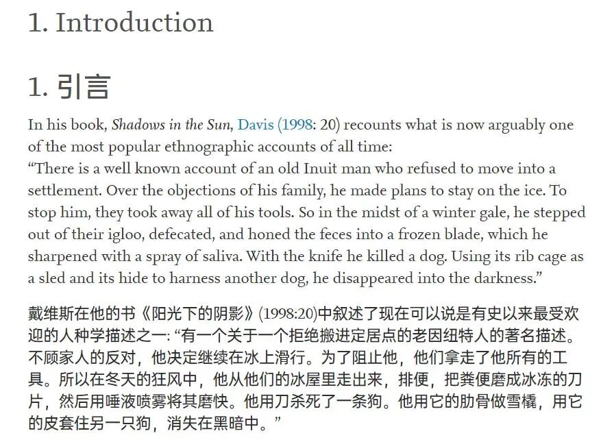 加拿大人类学家韦德·戴维斯在一本名为Shadows in the Sun的书中,讲了一个著名的因纽特人故事。一位不愿意迁移冰屋的老人独自留在了冰上,家人为了让他迁移,拿走了家中所有生产生活工具。一天,老人在冰屋外方便时突发奇想,既然排泄物在冰天雪地如此坚硬,为什么不用它来制作工具呢?