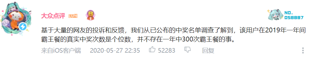 在他的澄清视频下,针对他对大众点评纪录的回应“海鲜基本都是霸王餐”,大众点评官方下场回应“该用户2019年一年间霸王餐是个位数,并不存在一年中300次霸王餐”。