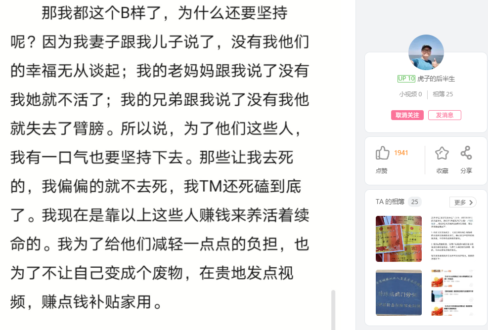此前提到,早在刚加入B站时,收获众多关注的付申虎,就表明了自己做视频的三个目的“给家人留作回忆”“提醒网友注意身体健康”和“赚一份自媒体的收入作为治疗费用”。他直言自己的医疗费用由家人负担,在看到母亲因为想要为他多出些钱“治病”,从事繁重农务劳累至中风后,决定用自己仅有的网络知识,为了“不做个废物”加入“小视频创作”补贴家用。