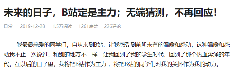 2019年12月28日,“虎子的后半生”在B站发布了标题名为“未来的日子,B站定是主力;无端猜测,不再回应!”的专栏。在文章首段,他称B站用户为“亲爱的同学们”,并感谢他们给他带来的“前所未有的感动”。