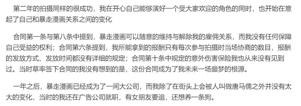 在这篇文章中,他详细介绍了自己当初加入暴漫,成为唐马儒,并最终与暴漫决裂的经历。他在文章开头写道“ 唐马儒是谁?他是“首席鉴黄师”、“肯打鸡CEO”还有“拔粪青年”,但至少,现在已经不是我曾经扮演过的那个形象了。”表明自己与唐马儒这个荧幕形象,将彻底摆脱干系。