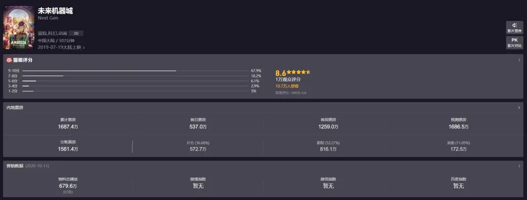 但在它上映刚满一周后,同样作为国产动画电影的《哪吒之魔童降世》横空出世,一举创下了中国影史票房的又一个奇迹,整整50亿的票房总额,让《未来机器城》望尘莫及。