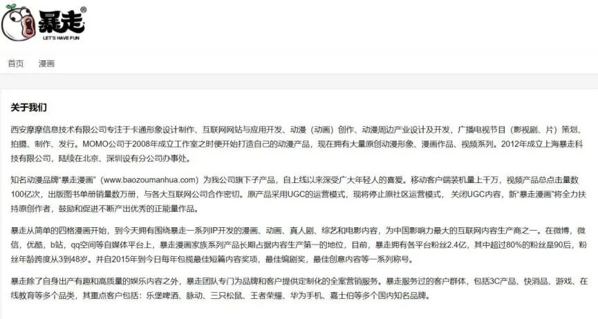 在最初的公司发展规划中,西安摩摩信息技术有限公司的经营范围设定为,动漫制作(不含影视制作),文化艺术交流活动策划等。可以看出当时的公司主营业务,应该就是暴走漫画。但在机缘巧合下,王尼玛这一形象诞生了,还因此衍生出了《暴走大事件》这一档网络综艺节目。
