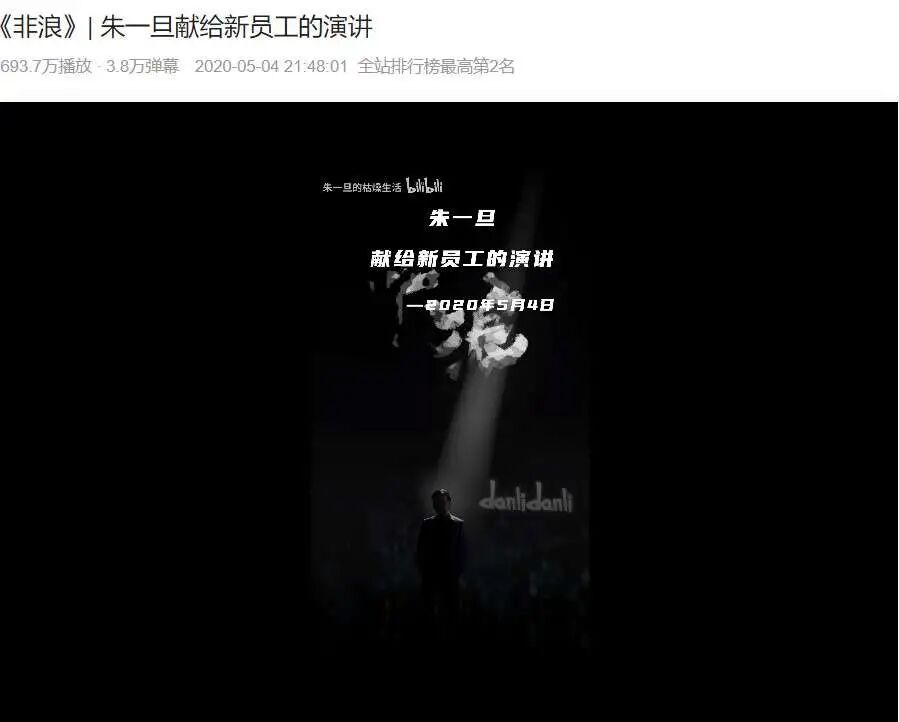 第二次破圈,则发生在B站发布自家的宣传视频《后浪》之后。当时看到这部B站的宣传片,张策立马就受到了启发,参照着《后浪》的主题和拍摄模式,制作了《非浪》。《非浪》的主题,虽然依旧是朱一旦惯用的“将员工送往非洲”,但结合当时《后浪》的热度,《非浪》与《后浪》在宣传主题以及最终的宣传效果上,都形成了鲜明的反差。年轻人不认可《后浪》所代表的生活样貌以及价值观,反倒对《非浪》自带的讽刺效果深深着迷,这让朱一旦再次收获了极高的人气。