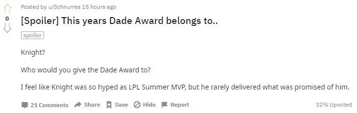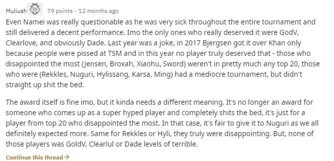 当然,也有人对这些讨论持不同意见,按照大帝奖的设立初衷,其应该是奖给“辜负了赛前评价的最被高估的选手”,如果按照这个标准来看的话,即使TES进入了四强,如果按照此前左手被夸耀的有机会成为下一个Faker的言论来看的话,左手获得大帝奖也算是“实至名归”。